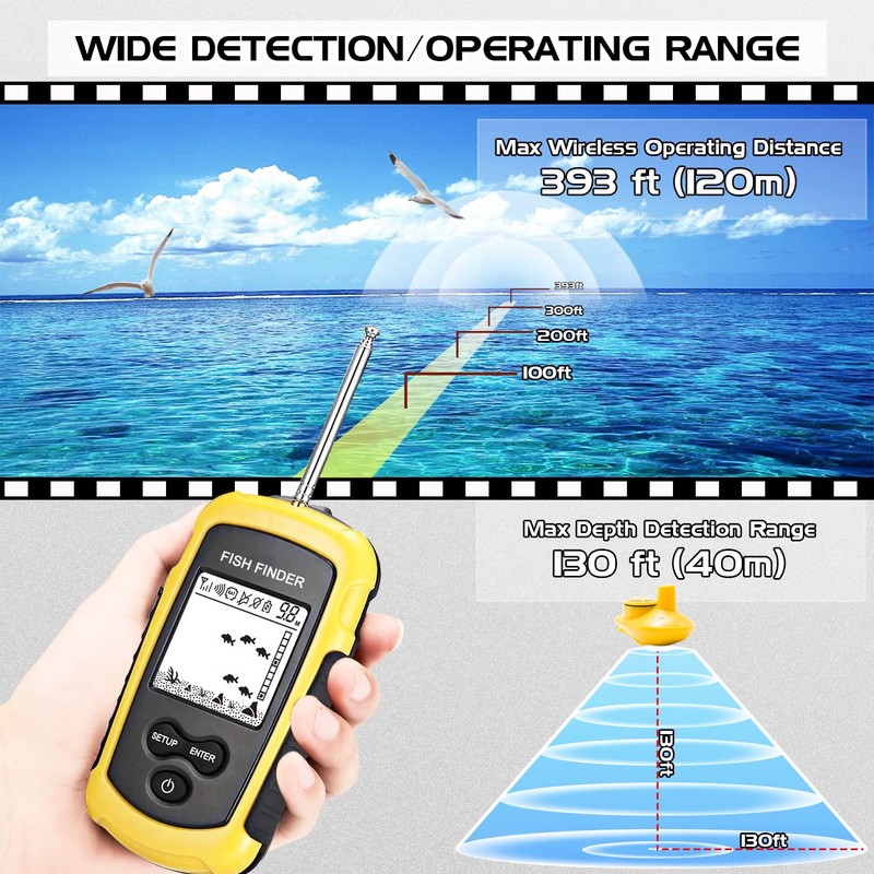 - Max wireless operating distance of the portable depth finder is 393 ft (120m), and the water depth detect range is 2.3 ft (0.7m)~130 ft (40m) with 90° sonar beam angle. The sensitivity of water depth finder is 5 levels select-able, so no matter the water is clean or turbid, the fishing finder will give you a correct information under water. The operating temperature of handheld depth finder is 14°F to 122°F(-10°C-50°C).
