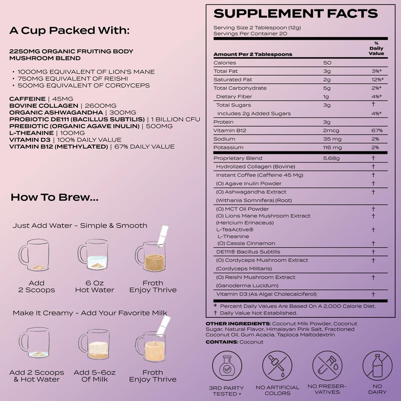 - HIGH QUALITY INGREDIENTS HAND SELECTED FOR THEIR BENEFITS AND TASTE: Coffee, Pre/Probiotic, Ashwagandha, Lion's Mane, Reishi, Cordyceps, L-Theanine, Collagen, Vitamin D3 & B12 (Methylcobalamin), MCT Oil, and Cinnamon