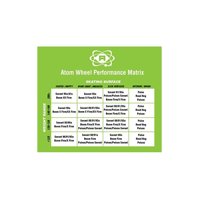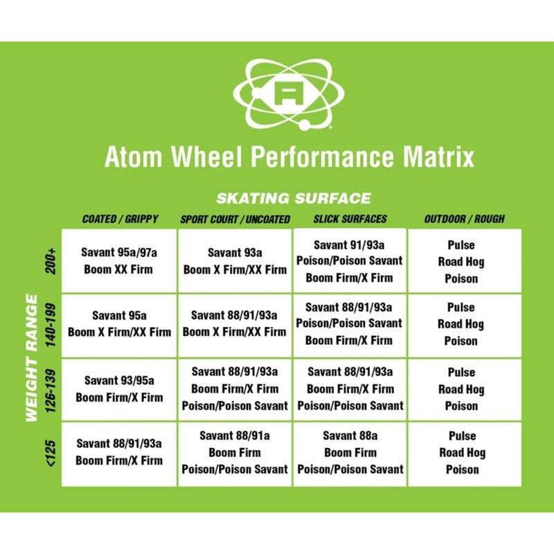 • Atom Pulse offers the best ride in an outdoor quad wheel on the market today Outdoor Quad Wheels Features: Size: 65mm x 37mm; Hardness: 78A; Surfaces: Sidewalk, Boardwalk, Asphalt; Technology: Hollow Core Technology