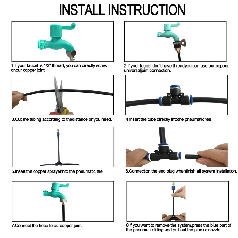 - 2.Quick installation.Without complicated installation process,no need to be heated to connect with fittings and sprinkler heads.Atomizing kit use pneumatic accessories to connect, directly insert the line, will not leak.