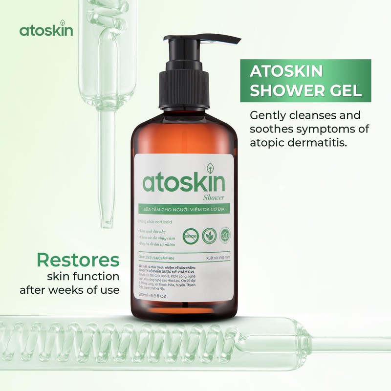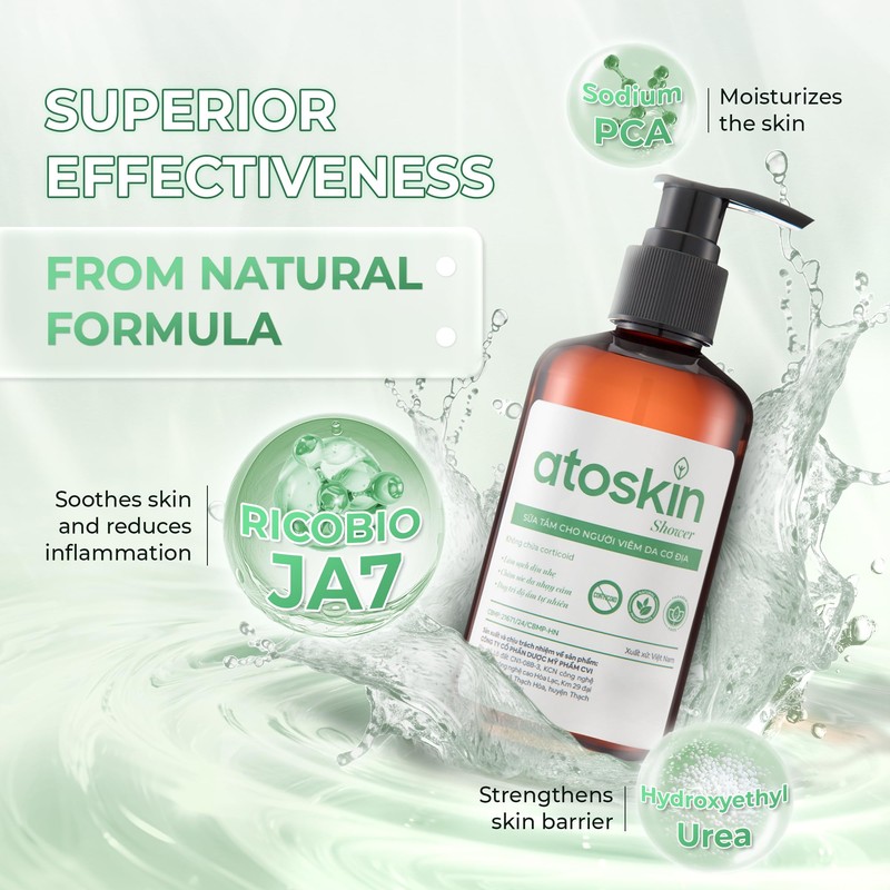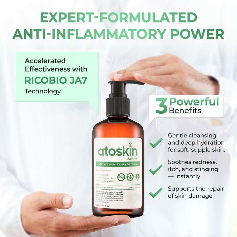 Atoskin Shower Gel for Eczema, Psoriasis, Dermatitis, and Anti-Itch Relief with RicoBio JA7 - for Atopic Dermatitis Patents (6.8 oz)