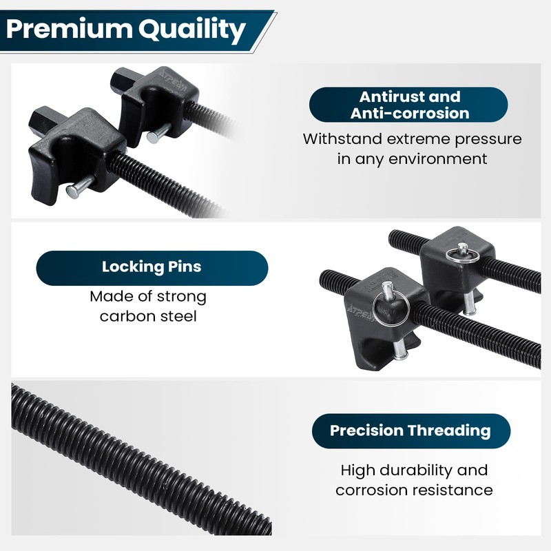- Safe & Stable Grip: The wide end pieces lock on to your coil springs quickly and easily and keep a secure hold as you work, with locking pins offering additional security and precision, hex-shaped end for a 7/8-inch wrench or socket and allows a 1/2-inch extension for adjustment if the strut is too close to the tool, 11.5-inches threaded rods for 10-inches to 10.5-inches maximum opening to fit jaws to coils