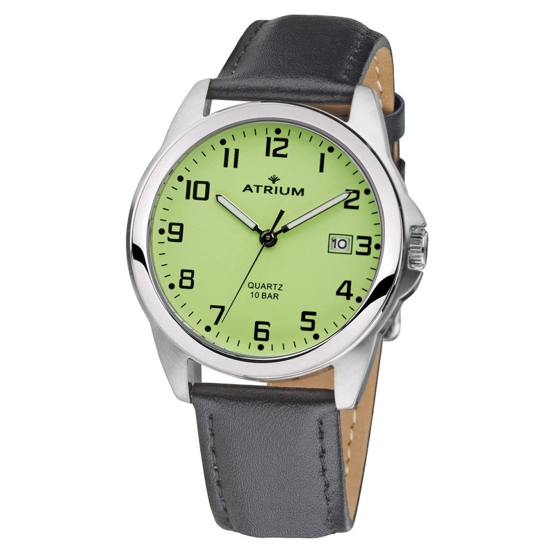 Atrium Mens Watch Super Clear Silver Luminous Hands Luminous Leaf Date Quartz 10 Bar Leather Strap A16-12, light green, Strap.