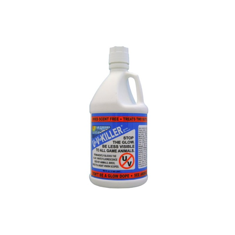 U-V-Killer blocks ultraviolet reflection and luminescence. For all fabric, camouflage and blaze orange. One bottle will treat two sets of hunting clothes. The original U-V-Killer and Sport-Wash Combo Pack has changed how hunters think about camouflage. It has been proven that animals and birds have sensitivity to ultraviolet light and the 438nm short-blue wavelengths that humans are blind to. U-V-Killer absorbs U-V wavelengths and thereby eliminates the blue glow caused by fabric dyes and detergents that contain U-V brighteners. U-V Killer and Sport-Wash are two revolutionary products which eliminate the brighteners from your camouflage. They make your camouflage almost invisible to the keen eyes of deer and other game. First wash new or soiled garments in Sport-Wash. Then spray on U-V-Killer. U-V-Killer absorbs the ultraviolet light and literally kills the blue-white glow which animals and birds so easily see on untreated garments. For a better chance at all wild game, treat your camouflage and blaze orange with U-V-Killer. It should be noted that a single washing in commercial detergents or fabric softeners will (while not removing the treatment) render the U-V-Killer useless by depositing new brightener dyes. Always wash treated clothes in Sport-Wash.