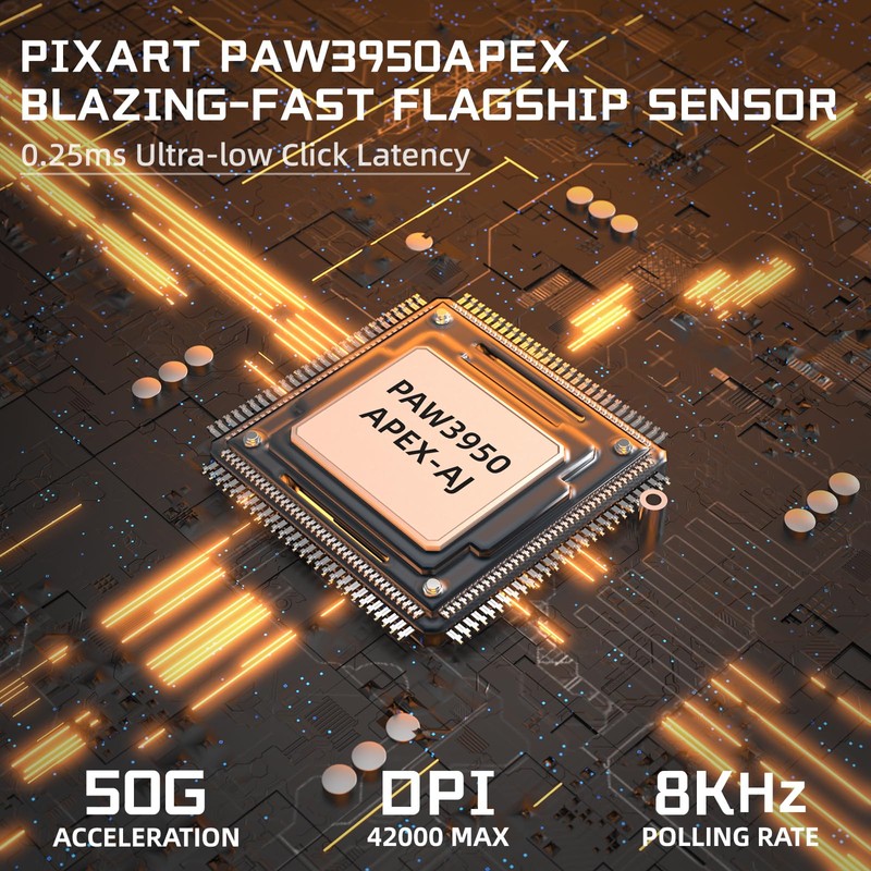 - 【Flaggschiff-Sensor der neuen Generation, PAW3950APEX】Ausgestattet mit dem neuesten PAW3950-Sensor von PixArt, der erstklassige Genauigkeit und Präzision für rasante, wettbewerbsintensive Spiele bietet und 42.000 programmierbare DPI, 8000hz/0,125ms Polling-Rate, 750 IPS-Geschwindigkeit und 50g Beschleunigung ermöglicht.