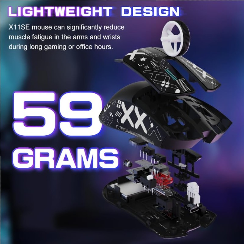 - High Performance Anti-slip Stickers: X11SE lightweight mouse wireless is equipped with a specially designed soft grip tape that absorbs sweat and increases grip, enhancing the stability of mouse operation. This sticker has easy-to-tear characteristics to prevent damage to the mouse when removing or replacing the grip tape.