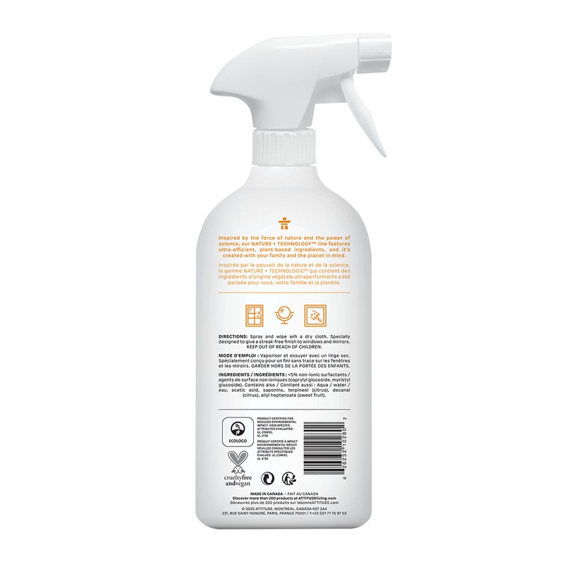 ATTITUDE Nature + TechnologyMC Window and Glass Cleaner is the natural and efficient cleaner you’ve been looking for. Thanks to its formula which contains plant- and mineral-based ingredients like saponin, a natural cleansing agent, your mirrors, windows and glass surfaces will shine clean! This mirror and glass cleaner is packed in a practical spray bottle, and you don’t need to rinse after washing to enjoy a streak-free result. PETA Certified and vegan, ECOLOGO Certified and biodegradable, this mighty cleaner naturally smells like citrus zest.
