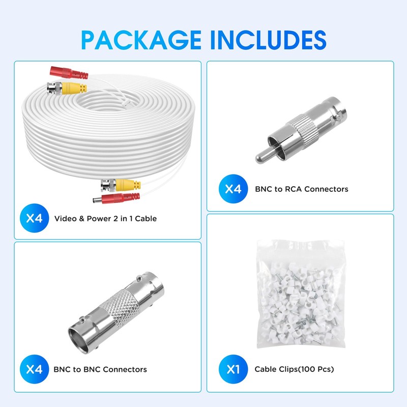 - 【Quality Assurance】1 Package included 4 pieces BNC cables and each cable is 60 Feet,8 Pieces connectors(4 Pieces BNC to BNC female connectors,4 Pieces BNC female to RCA male connectors) ,100 Pieces cable clips.Please feel free to contact us if you have any questions or concerns.Our customer service will reply within 24 hours.