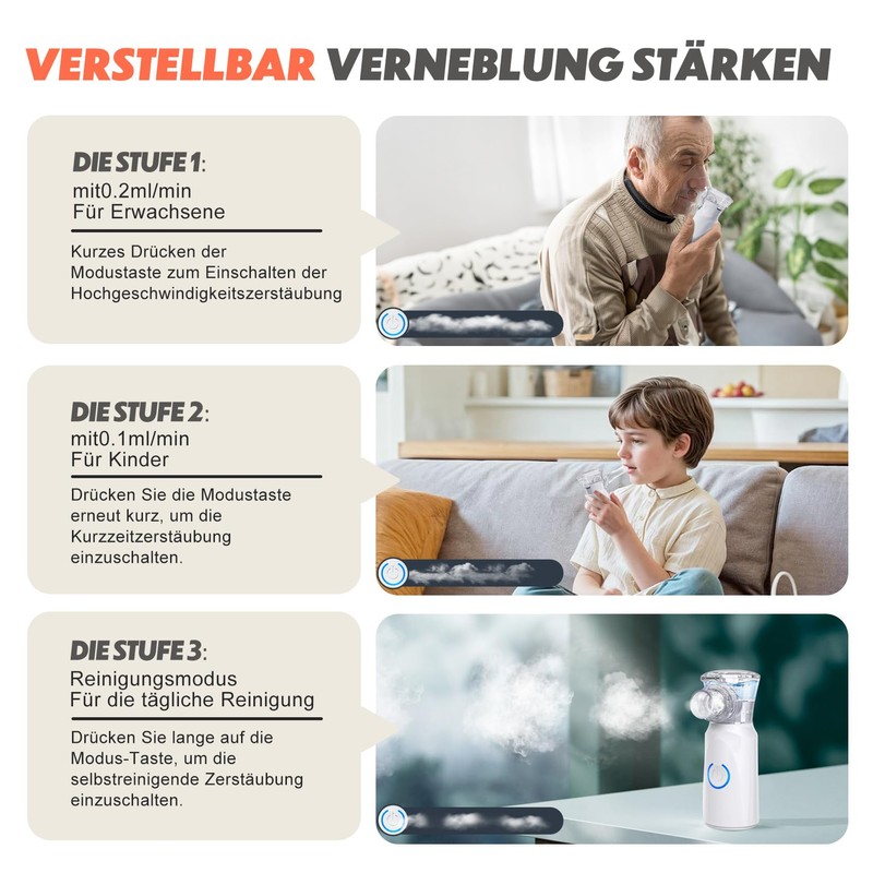 - Geräuschloser Betrieb: Eines der herausragenden Merkmale unseres Inhalationsgerät baby ist sein leiser Betrieb. Im Gegensatz zu anderen Geräten arbeitet unser Inhalator für Erwachsene und Baby flüsterleise, so dass Sie Ihren täglichen Aktivitäten nachgehen oder ihn sogar während der Arbeit, beim Fernsehen, beim Schlafen usw. verwenden können, ohne dass es zu Störungen kommt, was die Behandlung angenehmer und stressfreier macht.