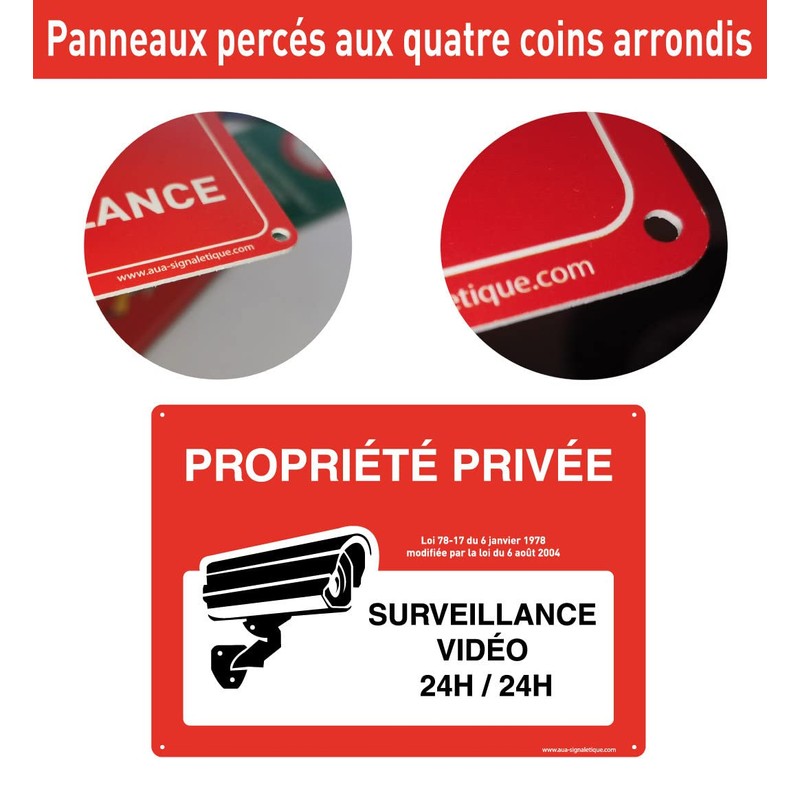 Dieses Hinweisschild mit vorgebohrten Ecken und abgerundeten Ecken ist ideal, um die Anwesenheit von Videoüberwachung in diesem Privatgrundstück zu signalisieren.