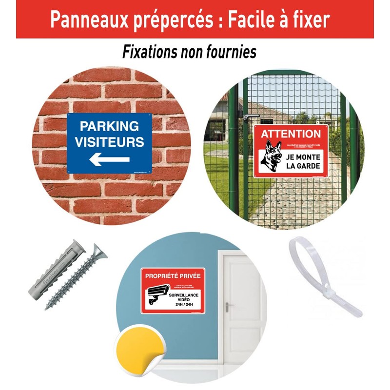 - Attaching your traffic and sign is easy to attach to a grid or wall. - Drilled in all four corners, our signs are simply drilled with screws or double-sided adhesive tape (smooth and clean walls) or with plastic clamps for the cooking grates. - Plastic clips, screws or double-sided tape are not included. - For added safety, the panels are rounded at 4 corners.