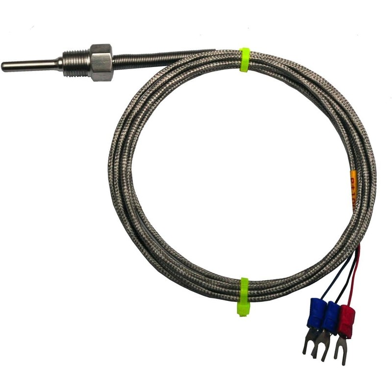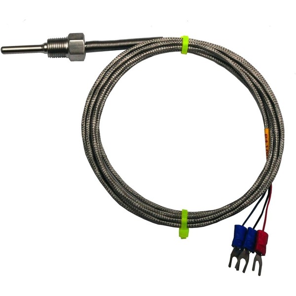 This Pt100 RTD temperature sensor is for applications that need liquid tight seal . It can be easily installed either on a tank or on a pipeline (with a T joint). The probe body is made of stainless steel. The mounting is 1/8" NPT thread. The sensor comes with 6 ft (2 meters) three-conductor cable that has TEFLON insulation and stainless steel braid protection. It's compatible with our SYL-1812RA or SYL-1813 gauges.