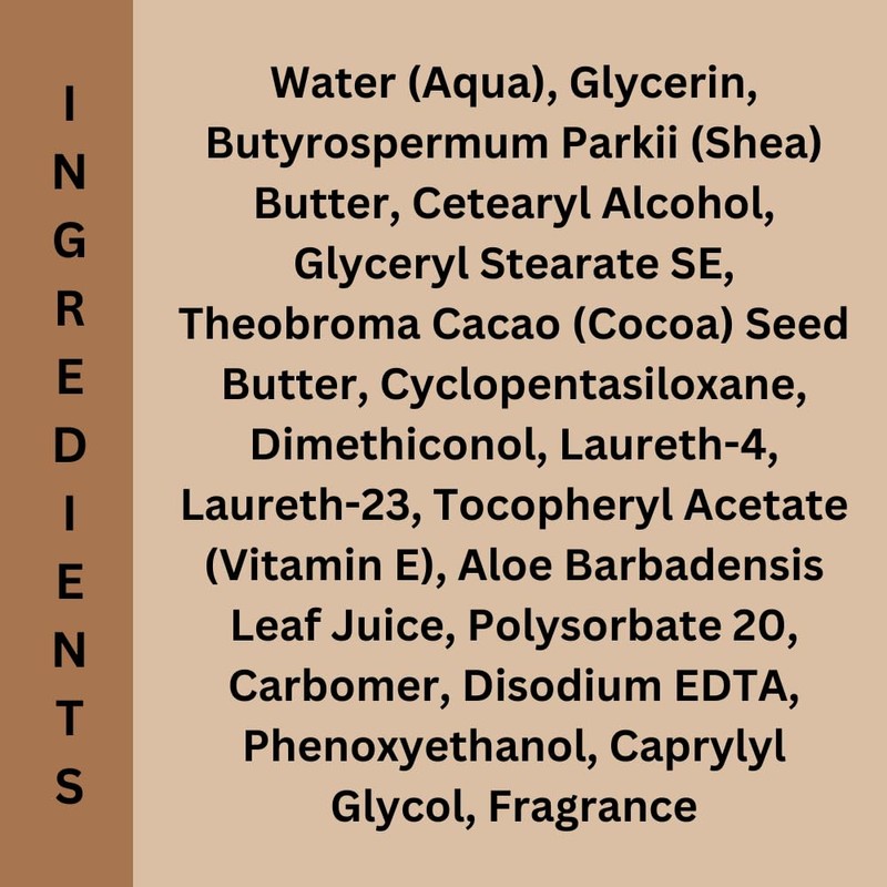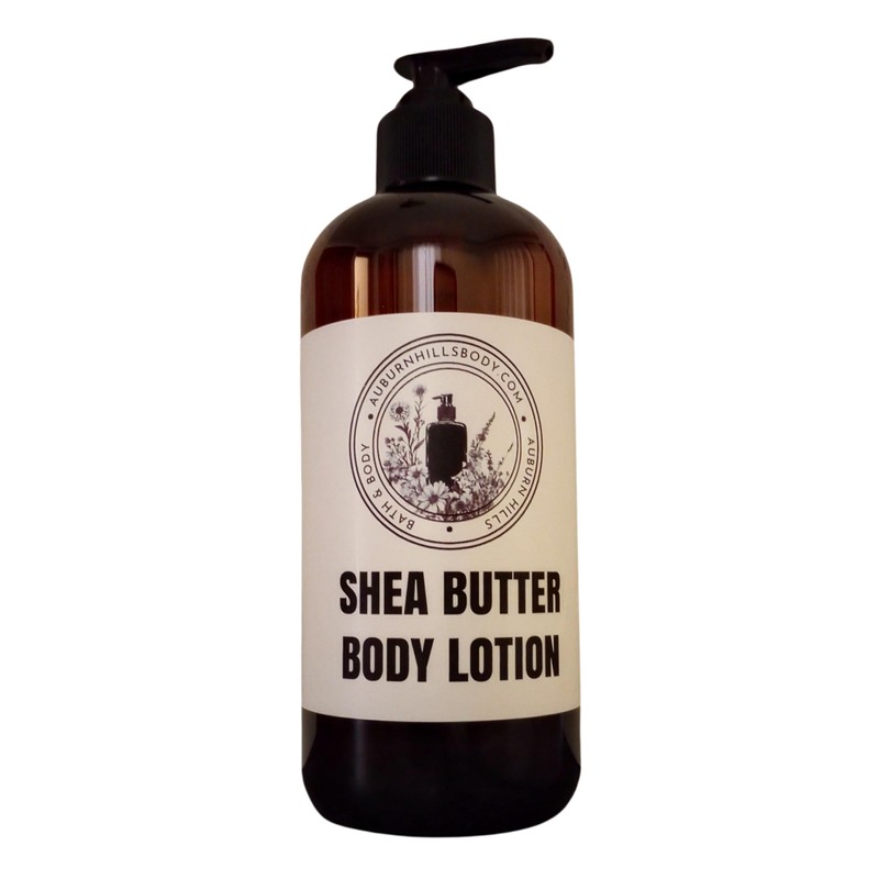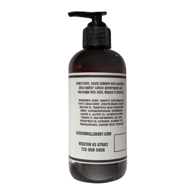 - Auburn Hills Shea Butter Body Lotion with Cocoa Butter, Aloe Vera, Glycerin, and Vitamin E to naturally nourish and hydrate dry and damaged skin