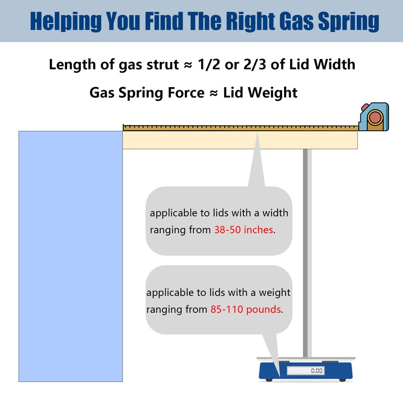 - 【Tips】The gas strut has a force of 100LB/445N and is only suitable for doors/covers weighing between 85-110 pounds and measuring between 38-50 inches. Please measure the size and weight of the door before purchasing. If it falls outside of this range, the product will not be suitable.
