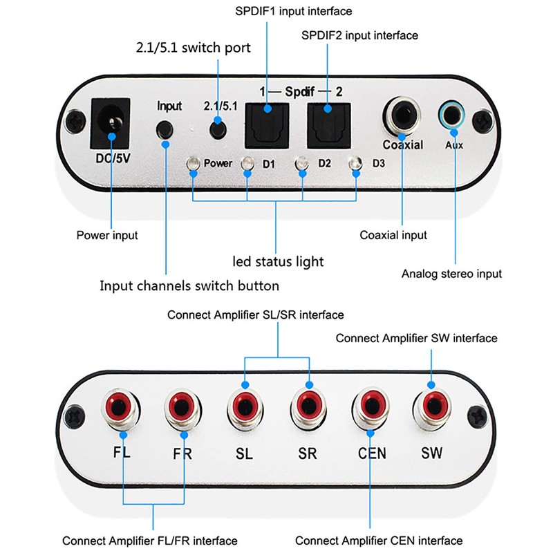 - INTERFACE FEATURES: input connectors: optical, coaxial, stereo. Output interface: CEN, FR, FR, SL, SR, SW. RCA output interface, convenient for docking amplifier.