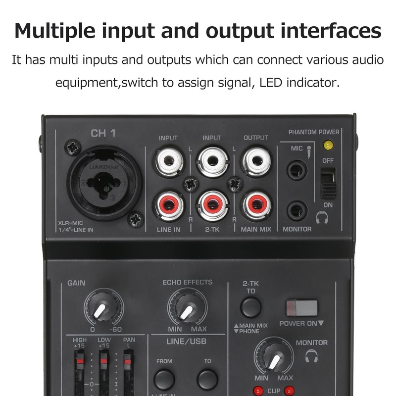 - 5 channel mixing console, made of metal shell, lightweight, compact palm size, convenient to carry