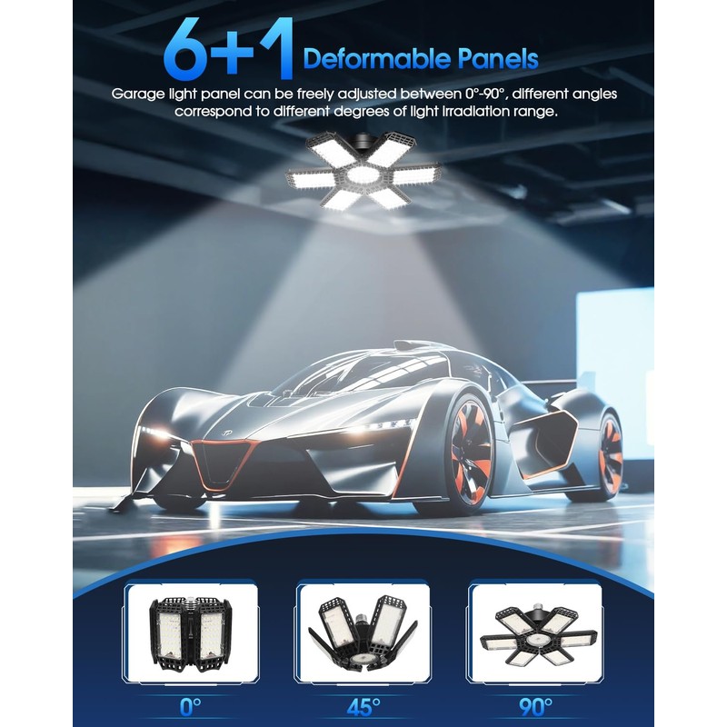 - 🏆Upgrade Deformable 6+1 Panels: Unique wide-angle led garage light design, can be adjusted from 0° to 90° which can have a perfect garage lighting distribution curve according to your application, compared to normal led light bulb, every dark corner can be brightly illuminated by its 6 adjustable panels