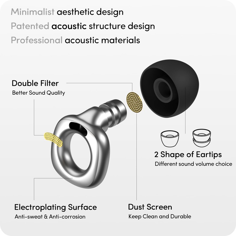 - Professional Design - Audree Style applies innovative and patented attenuation filters material inside the square ring. It provides the most natural and high-fidelity sound with noise reduced evenly. All the ear tips are made from food-grade silicone, which are skin-friendly for whole-day wearing.