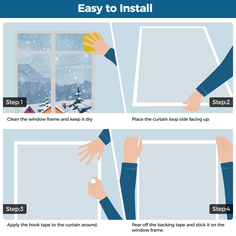 - Easy Installation: Installing the curtain is easy. The curtain has sewn loop strips, and the kit comes with adhesive hook tape for the window. Just put the hook tape around the window, then position the curtain so the hook and loop sides stick together.