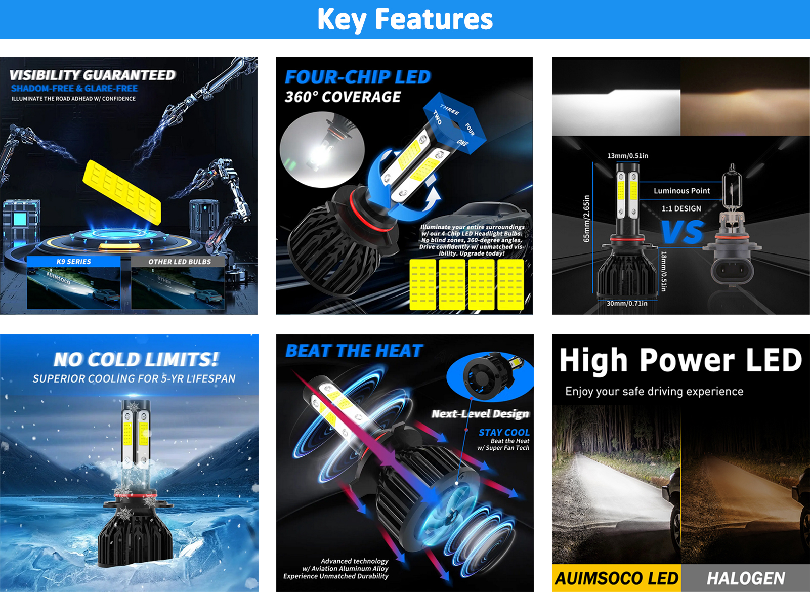 Equipped with high luminous efficacy LED chips. 10000LM/pair, 500% Brighter than standard halogen. K9 LED headlight bulbs ensure the clarity of vision allows drivers easy to react to sudden movement. Effectively illuminate wildlife, falling rocks and obstacles. Huge improvement for road safety.