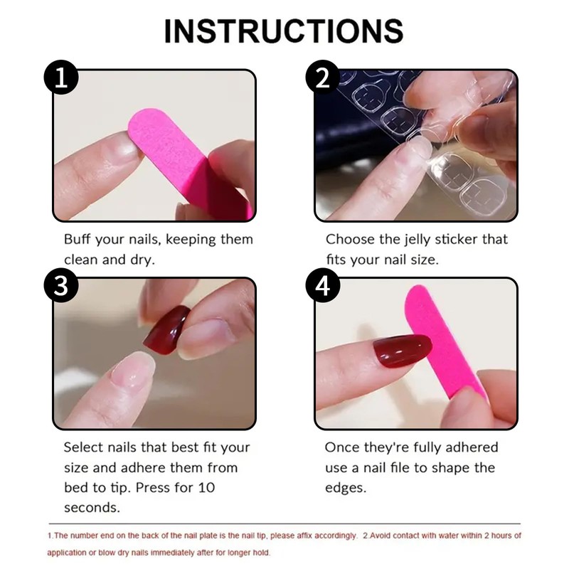 3.Easy to use: after trimming and cleaning your natural nails, choose the appropriate sizes of our high-quality false nails. Then apply the nail adhesive tape and press the nails for ten seconds. Within minutes you will have impressive new nails. These stick on artificial nails are ideal for quick and easy use at home