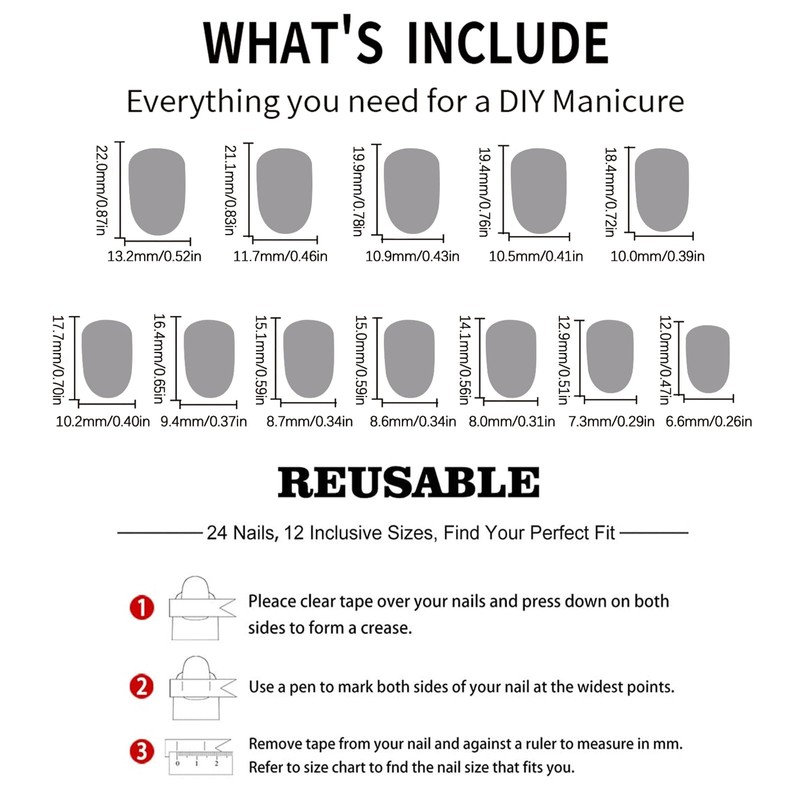 1. Practical set: the Auiremrti nail set contains twenty-four false nails, twenty-four pieces of jelly glue, a mini nail file, a wooden stick and two alcohol wipes. With these stick-on nails, you can achieve a beautiful French tip style in just five minutes without having to wait for an appointment in the nail salon. So easy and fast you can get flawless nails