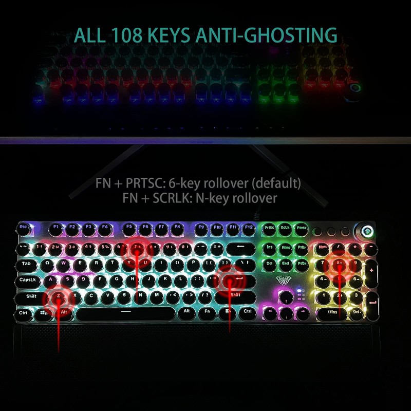- Retro Typewriter Style Round Keycaps: Mechanical blue switch offers a quicker and springier response, crisp click sound, precise tactile feedback for ultimate gaming performance. Double-shot injection molded vintage steampunk round keycaps for clear backlight and extreme durability. The stepped floating keycap fit your fingertips perfectly for precise positioning, prevent fatigue and wrong typing. Comes with keycap puller for easy keycaps cleaning