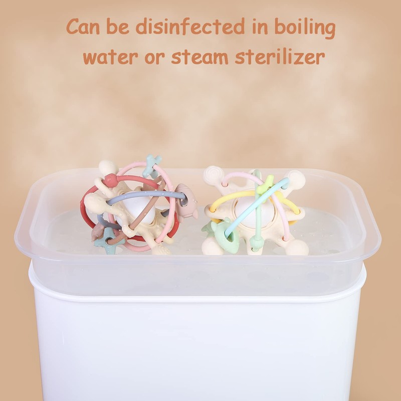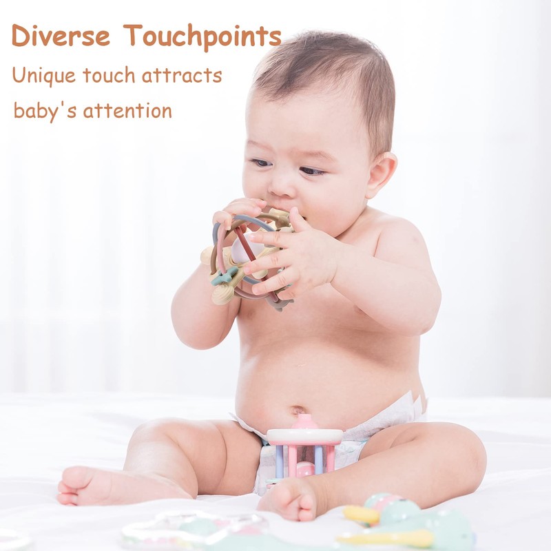 - BABY SENSORY TOY: The silicone teething toy is designed for ages 3 months and up, the rich colors develop color cognition ability. Hollow design and suitable size exercise grasping ability and fine motor skill. The gentle rattle sound, which provide auditory stimulus and also soothe baby's anxiety-a perfect shower gift for newborns and new moms.