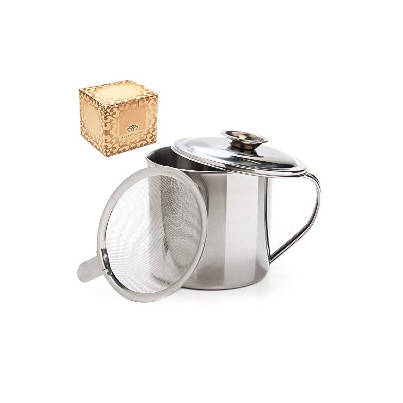 Aulett Home Bacon Grease Container With Strainer - Great For Storing Fats for Keto and Paleo, Cooking Oil and Drippings - 1.25 Quart Or 5 Cups Stainless Steel Grease Keeper