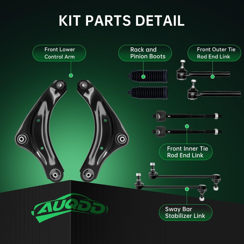 - 【Suspension Kit Include】 - 2 x Front Lower Control Arm w/Ball Joint Assembly - ( K621156 + K621157 ) Driver & Passenger Side, 2 x Front Outer Tie Rod End Links - ( ES801168 + ES801171 ), 2 x Front Inner Tie Rod End Links - EV800951, 2 x Front Stabilizer Sway Bar End Links - K750719, 2 x Rack and Pinion Boots
