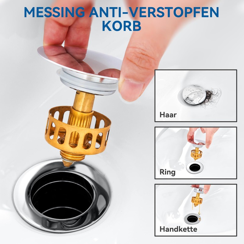 - REMOVABLE BRASS FILTER: the drain plug is equipped with a removable anti-clogging filter basket, which can be easily pulled out to remove hair and impurities and prevent jewelry and other valuables from falling down the drain
