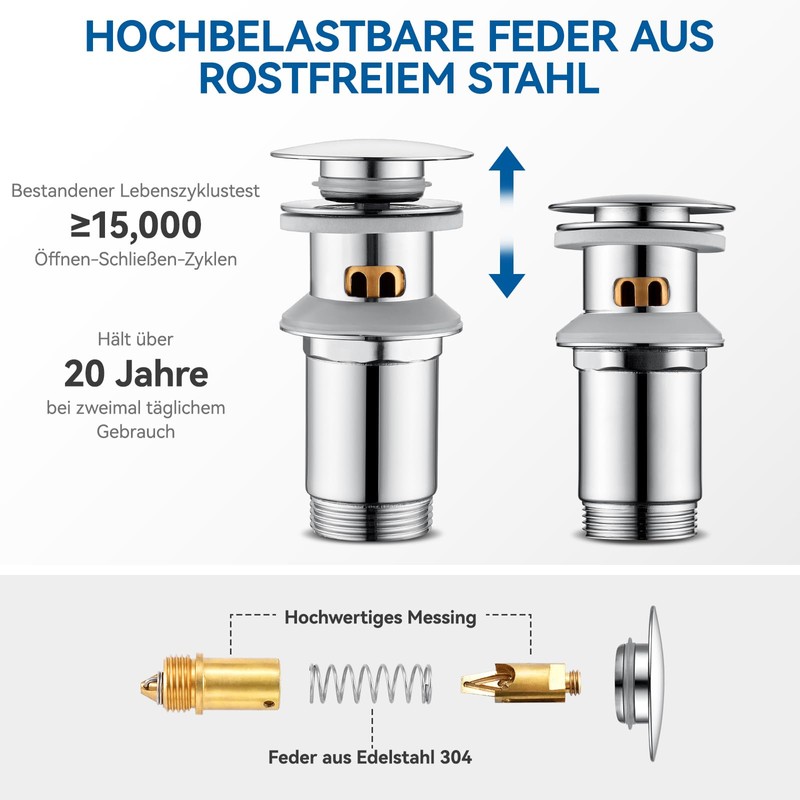 - BRASS SPRING CORE The sink plug is made of a high quality brass spring core, which ensures good elasticity and durability. One second to close and open the valve. Press the drain valve to store water, then press it again to drain it