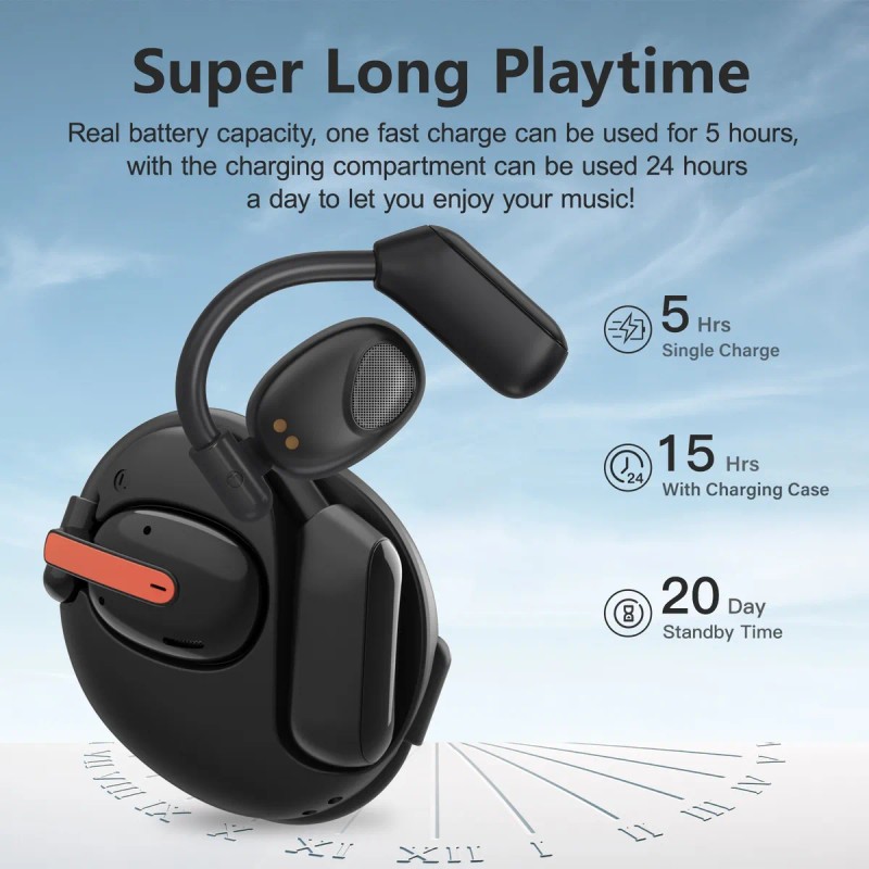 Los auriculares inalámbricos Bluetooth cuentan con un diseño abierto. En comparación con otros audífonos internos, el diseño abierto hace que los audífonos sean más cómodos y seguros de usar, evitando la fatiga o infección del oído incluso con un uso prolongado. Nota: Los contactos metálicos en la parte posterior de los auriculares tienen papel negro anticarga, que debe retirarse para permitir que los auriculares se carguen normalmente.