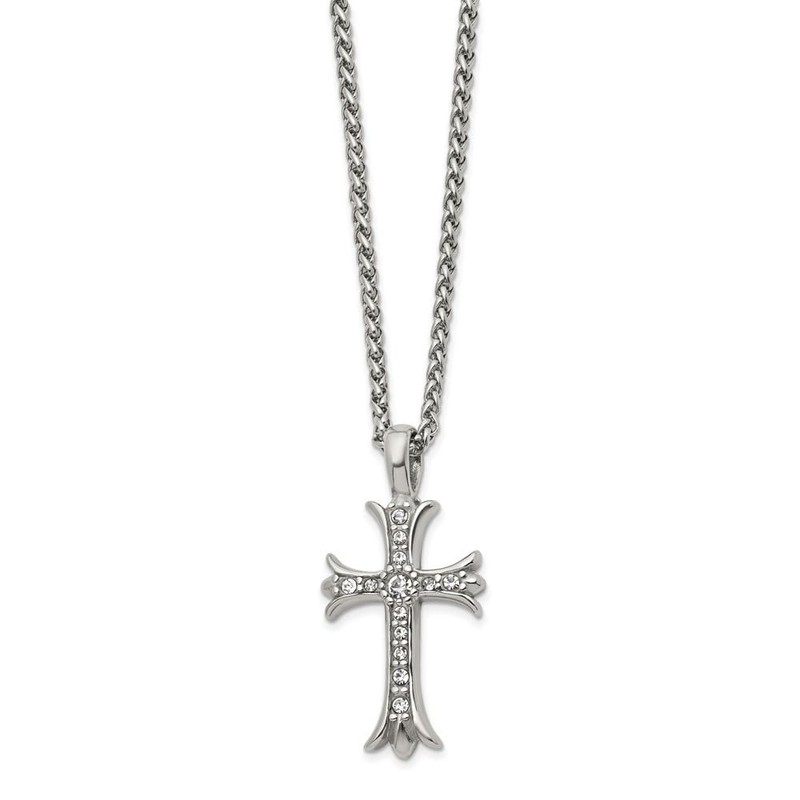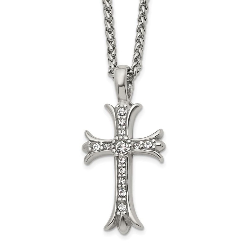 - PRODUCT SPECIFICATIONS : Stainless Steel Polished with Cubic Zirconia Fancy Cross Pendant on a Wheat Chain Necklace 24", Stone Type_1:Cubic Zirconia |Stone Quantity_1:13|Length of Item:24 in|Chain Length:24 in|Chain Type:Spiga (Wheat)|Chain Width:3 mm|Charm/Element Length:52 mm|Charm/Element Width:26 mm|Clasp:Lobster |Width of Item:26 mm|Bail Width:11 mm|Material Color:White|Bail Length:10.5 mm|Bail (Inside) Length:7.7|Bail (Inside) Width:5.7