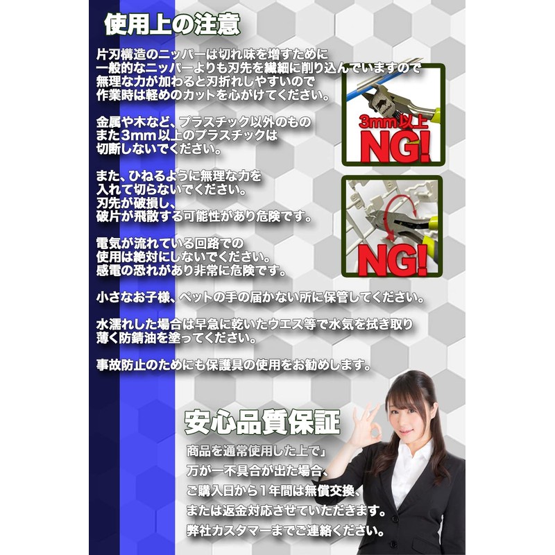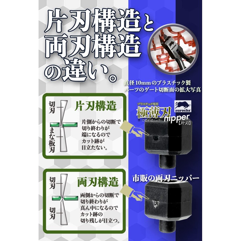 • Nippers specially designed for cutting plastic with single-edge construction and ultra-thin finish. Thin, delicately sharpened edge cuts parts out more beautifully than regular nippers.By cutting straight from one side with a sharp, ultra-thin single blade, you reduce plastic whitening, and it greatly reduces sanding after cutting, and greatly improves work efficiency.