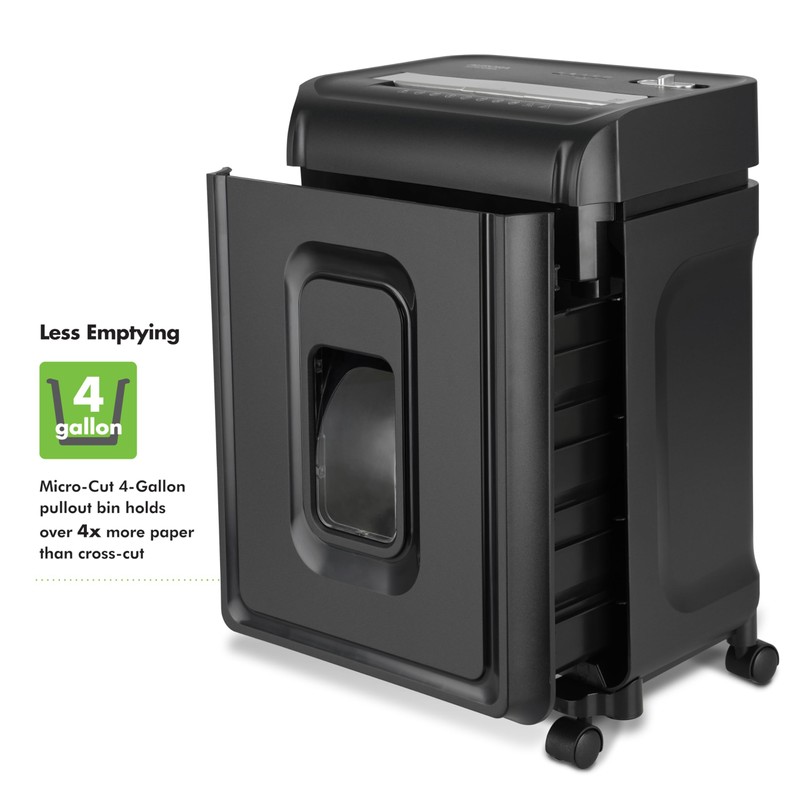 - High-security micro-cut with 8-sheet capacity; destroys credit cards
