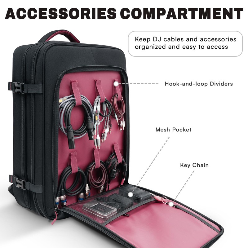 - Creative Storage DesignsWe've included 6 hook and loop closures in the laptop compartment of this DJ bag to keep your cables organized and easy to find. No more tangled cords! There are also three mesh pockets for extra storage space. In the accessory compartment we have designed a key fob to easily organize your keys