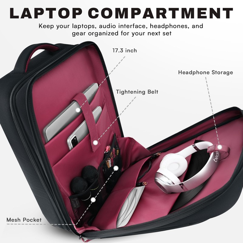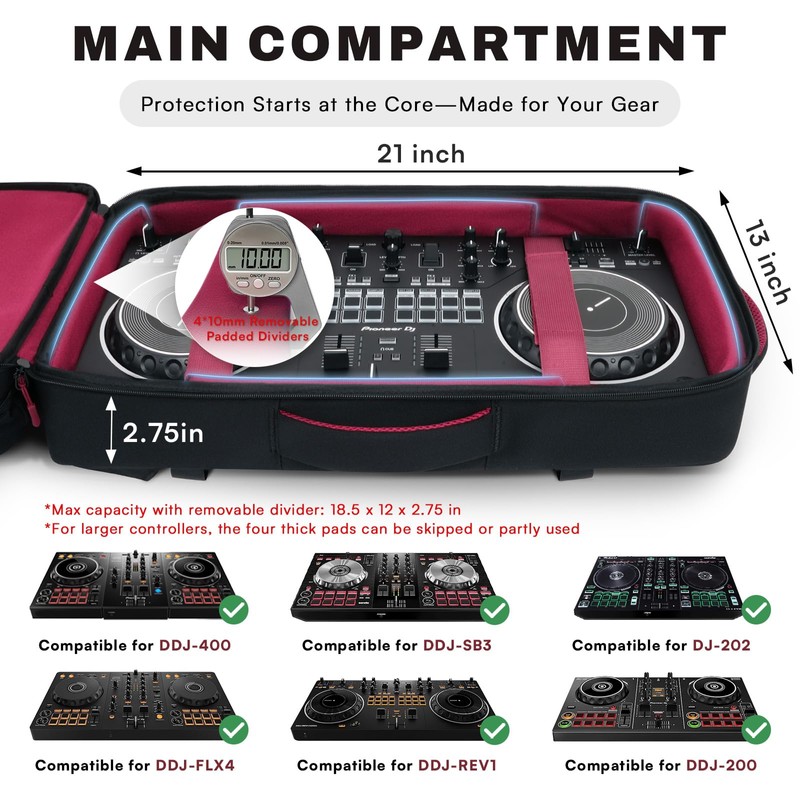 - Large Capacity Storage to Meet Your NeedsThis DJ bag is designed with four large capacity compartments. The main compartment can be adapted to DDJ-FLX4/DJ 400/DDJ-REV1 and other devices. This DJ gig bag has a separate compartment for laptop storage, featuring a padded liner to protect electronic equipment. The accessory compartment as well as the front compartment have a large capacity for organizing the rest of the small items that need to be easily accessible