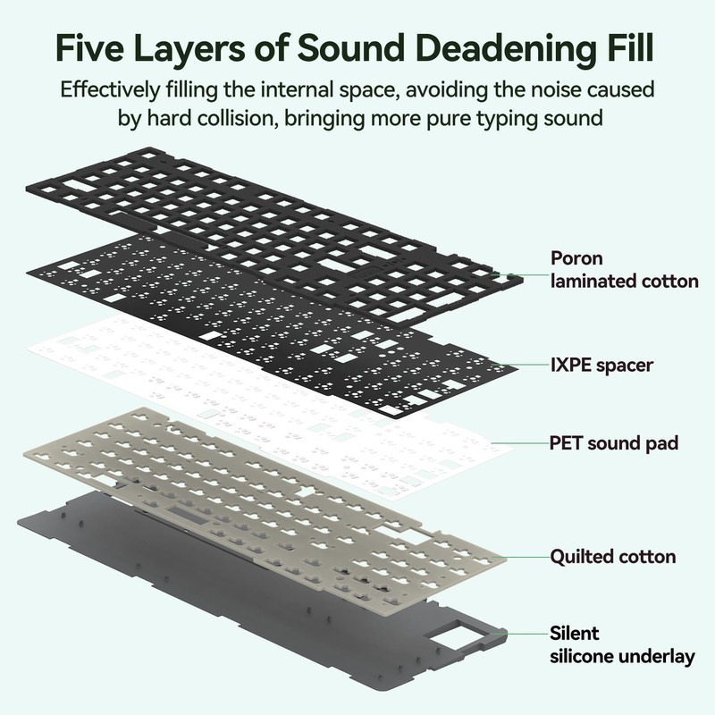 • Gasket Structure Design and 95% Percent Keyboard: Our Bluetooth keyboard utilizes a unique precision locking cover with gaskets and internal sound-absorbing and shock-absorbing layers. This construction reduces typing noise and resonance, providing a quiet, focused typing experience.97 keycaps in a compact layoutsave space while retaining the number keys and arrow keys.