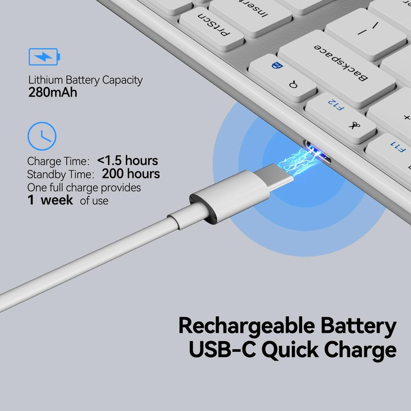 - Rechargeable Battery & Energy-Efficient: Our built-in rechargeable lithium battery ensures long-term use, with one full charge offering over a week of usage time. Additionally, our wireless flat keyboard conserves energy by entering sleep mode after 30 minutes of inactivity.