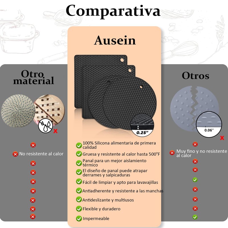 - Silicona de Alta Calidad y Grado Alimenticio: Ausein salvamanteles de silicona para la cocina están hechos de silicona de grado alimenticio 100%, libre de BPA, flexible y duradero. El material de silicona premium asegura que no se oxiden, agrieten o astillen y no es tan pesado como los trébedes de metal.