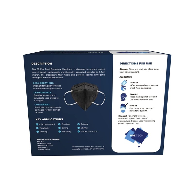 The most comfortable disposable face mask you'll ever wear! The PPE Tech P2 Face Mask is 4-layer, Australian-made mask with greater than 98% particle filtration efficiency. Extra comfy and strong earloops ensure a snug fit.