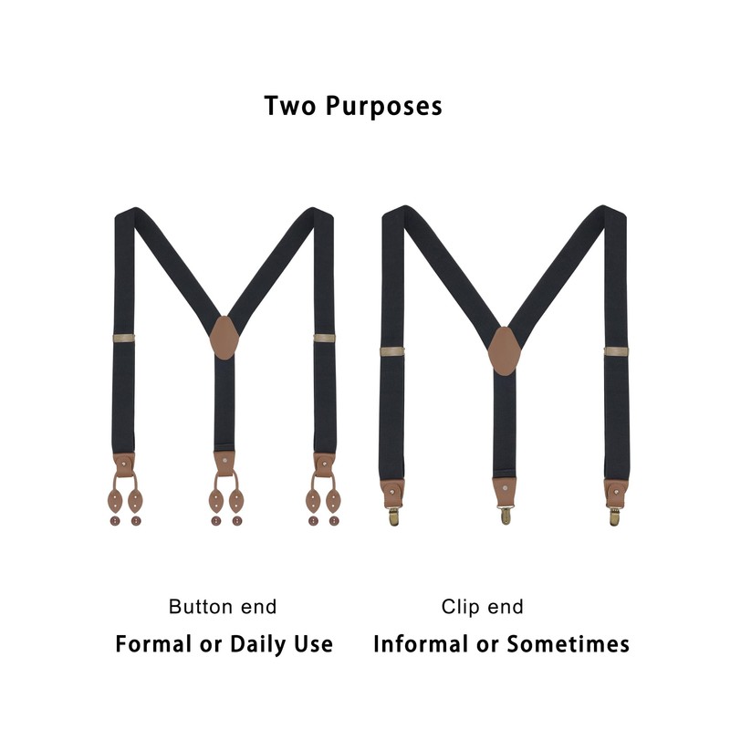 - Two purpose uses: button end for formal or daily use. Clip end for informal or occasional use. Suitable trousers to combine are: tuxedo, suit trousers, work trousers, motorcycle trousers, ski trousers or traditional clothing