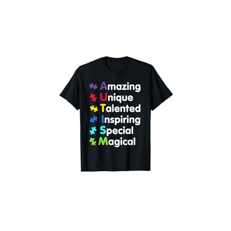 • This funny autism apparel reads "Amazing, Unique, Talented, Inspiring, Special, Magical". Wear this outfit to spread love and support Autism Day and to people who have autism. The design is made with colorful puzzles and meaningful funny words.