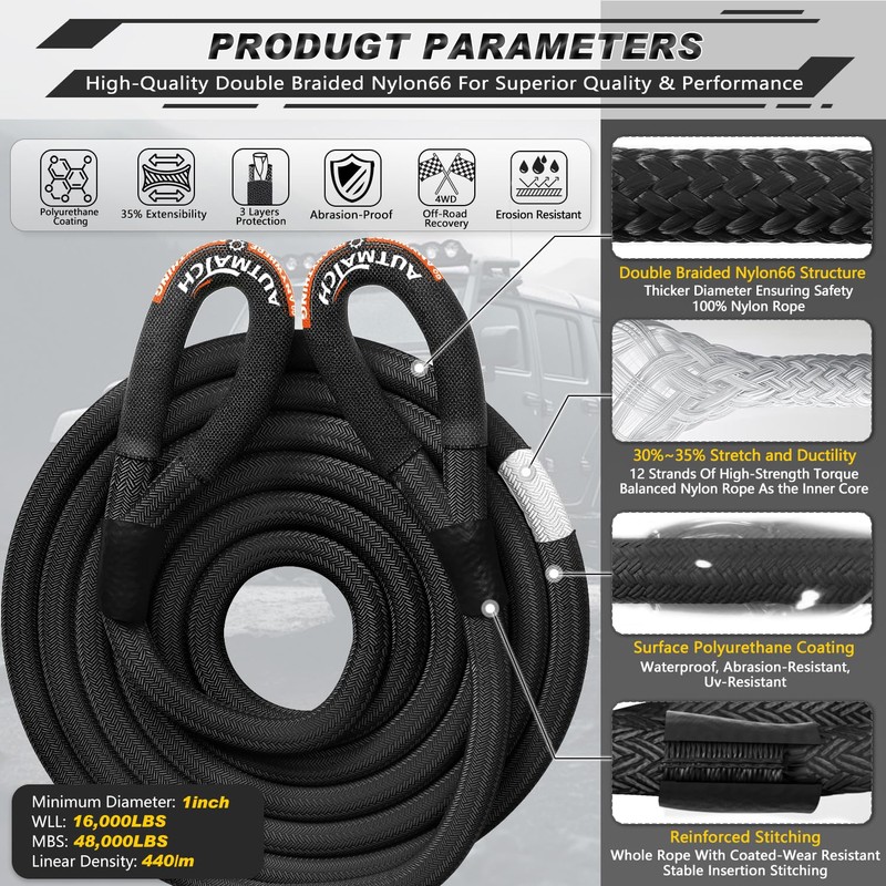 - Super Quality: The Kinetic Recovery Rope was Made of 100% Nylon N66 Double Braided Material and Coated with Mil-Spec Polymers, Which the Break Strength Up To 48000Lbs to Keep It More Safety & Stability, Capable of Recovering and Towing Off-road Vehicles, Pickups, ATV, Tractor, Truck Etc