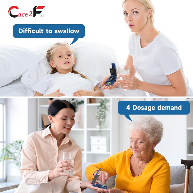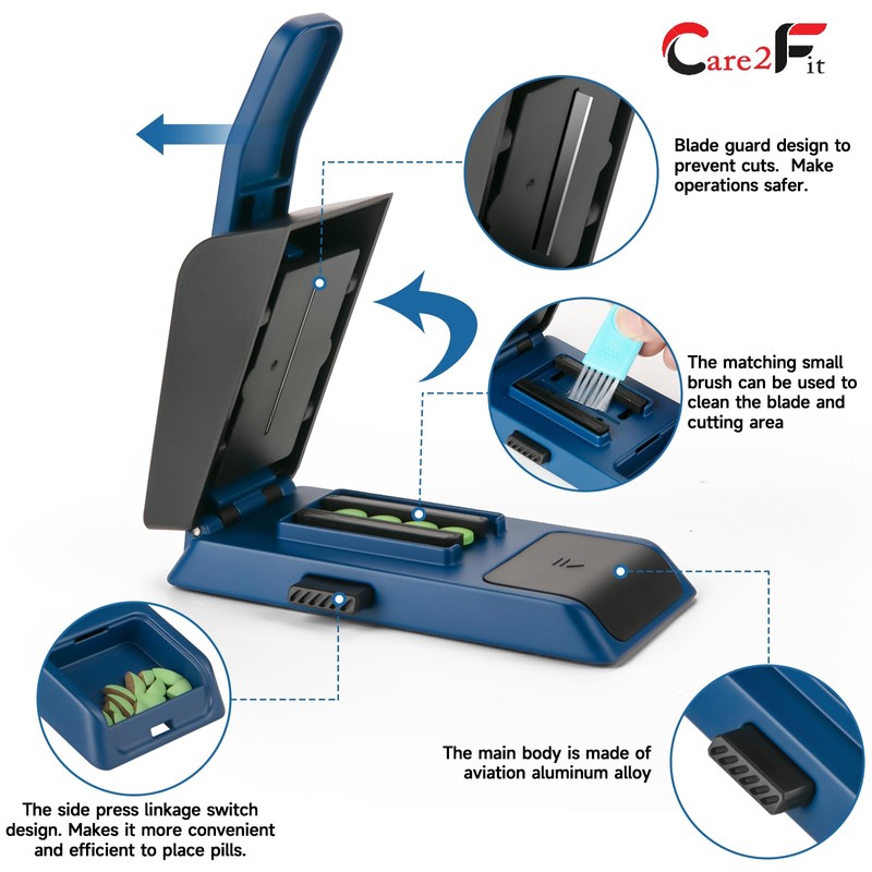 - 【Multiple sizes pill cutter】The Care2fit pill cutter linkage device can quickly center,accuracy split multiple pills at once.Our Care2fit pill cutter can safely accommodate pills of any size, round, rectangular or oval. This pill cutter splitter for small and tiny pills can cut pills with a width of 2mm-15mm, so it can easily cut tiny pills of 2.5mg.