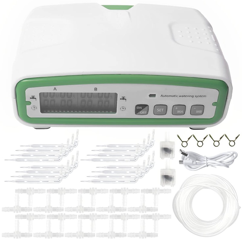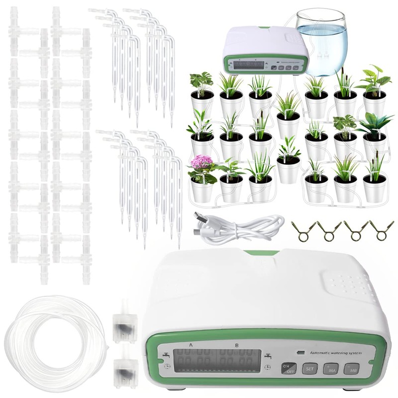 - [Auto Drip Irrigation Kit] The drip irrigation kit consists of 2 pumps, a timer, pipes and droppers which can supply water to each plant regularly and quantitatively according to your settings. Take better care of your plants when you are busy.