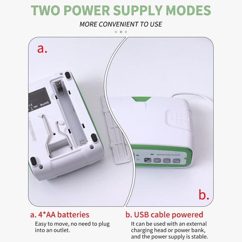 - [USB/Battery Powered] The plant watering device has 2 different power supply modes, USB powered or 4x AA battery powered. the battery power supply system is designed to prevent power failure.