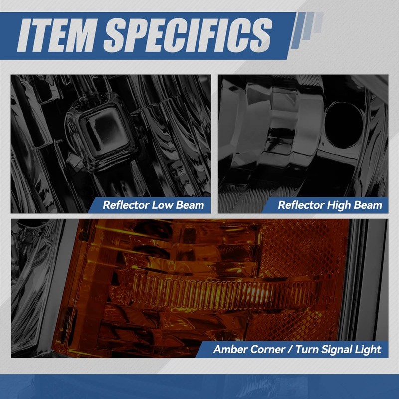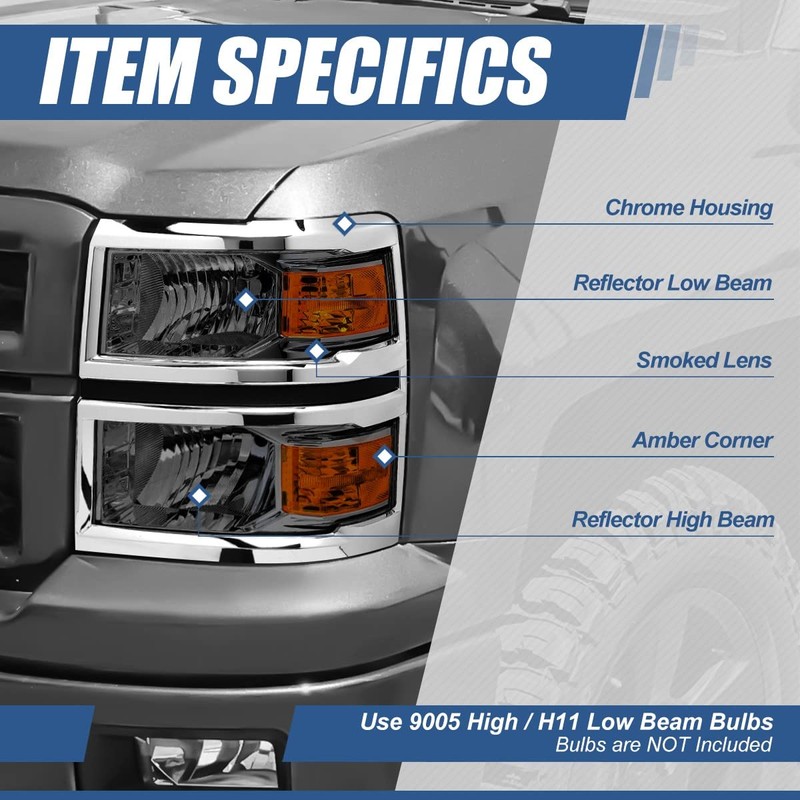 - Product Specific - Bulb Type: Halogen | Bulb Model: 9005 High / H11 Low Beam (NOT Included) | Signal Light: 7443A (NOT Included) | Housing Color: Chrome | Lens Color: Smoked | Corner Color: Amber | OEM Part Number: 20933724 20933725 20933722 20933723 23172782 23172783 | Parkslink Number: GM2502389 GM2503389 GM2502395 GM2503395 GM2502410