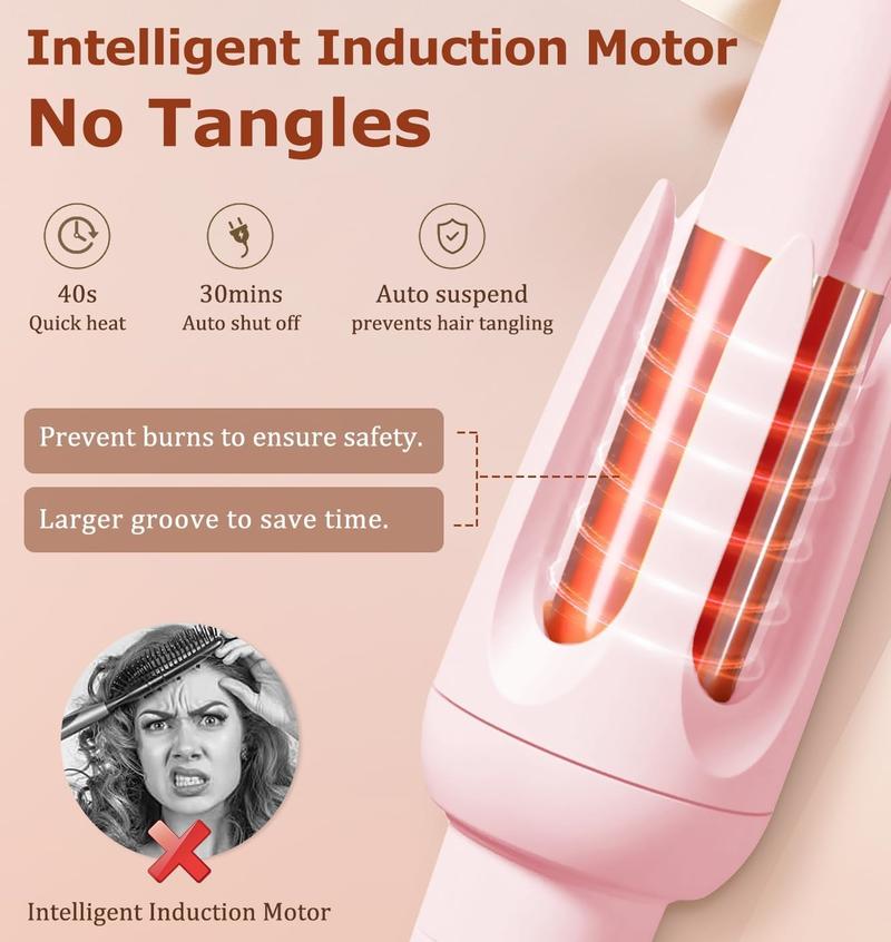 4 Temperature and 3 Timers: Our auto curling iron provides 4 temperature options ranging from 140°C to 200°C, which can accommodate various hair types and guarantee an ideal outcome every time it's used. Moreover, this hair curling wand comes with a two-way rotation function, which makes it easy for you to switch the direction of the left and right curls. Whether you prefer big, loose waves or small, tight curls, it can meet your needs. The 3 speed smart timing settings (10 seconds, 15 seconds, 20 seconds) can fulfill your different styling requirements and help you effortlessly create the appropriate hairstyle for every occasion. However, it should be noted that this automatic curling iron isn't highly suitable for people with short hair. Automatic Shut-off and Convenient Design: Our automatic hair curling iron is equipped with a 360° swivel power cord. This gives you ample space to operate while using it and prevents the cord from tangling, which also makes storage convenient. For your safety, if the curling iron doesn't detect any operation within 30 minutes, it will automatically turn off, offering you maximum security. This smart safety feature ensures that you don't need to worry about forgetting to switch it off, allowing you to have a worry-free and stress-free experience. Anti-Scalding and Anti-Tangling: Our automatic hair curling iron is equipped with a smart magnetic induction motor that effectively prevents hair from tangling or being pulled, safeguarding your hair from damage. The top part of it has a special anti-scald design. Even if it's used for a long period, it can effectively prevent burns and make the operation safer. Ideal Thing to Protect Your Hair: This automatic curling iron is made of ceramic glaze, which releases a large number of negative ions. These negative ions can lock in moisture and prevent heat damage. It can also eliminate static electricity, smooth frizz, and make your hair soft and shiny. The package includes a comb and two hair clips, which further simplifies the process of styling your hair. Whether it's for friends or loved ones, this curling iron set is an ideal choice.